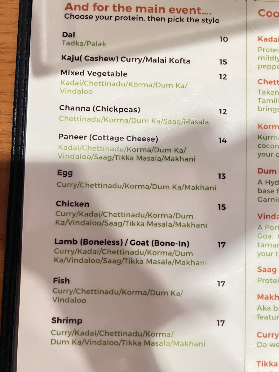 Available styles: Chettinadu/Korma/Dum Ka/Saag/Masala